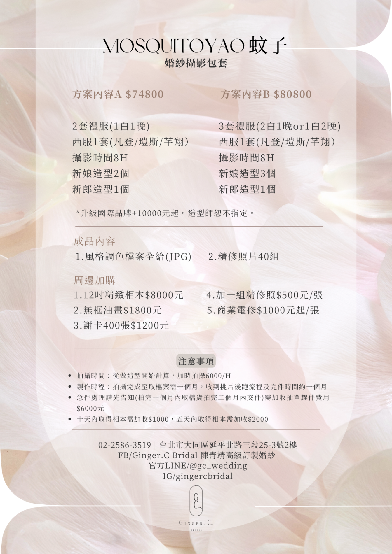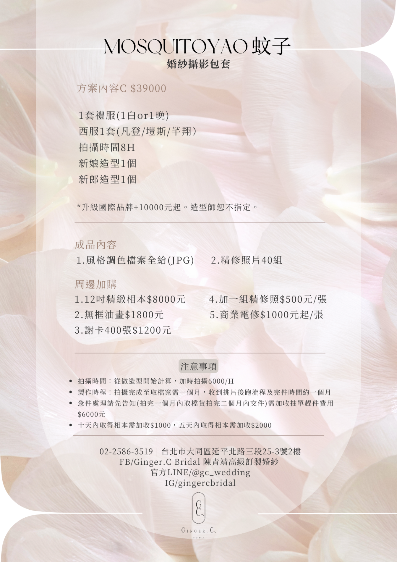 Ginger.C Bridal與 MOSQUITOYAO 蚊子 聯名合作,一同滿足每位女孩變成女人的夢想,為您提供自主婚紗/自助婚紗攝影包套服務 此方案主要包含 婚紗攝影、整體造型、新娘禮服、新郎西服。
