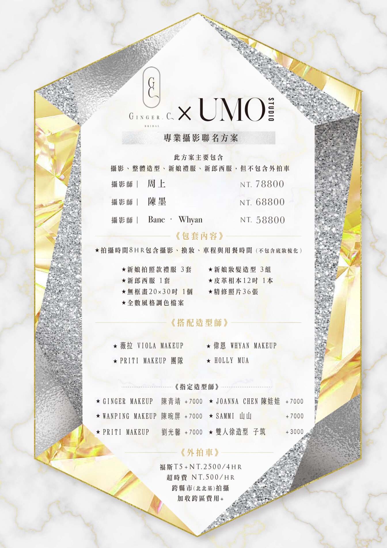 Ginger.C Bridal與 ÜMO Studio優墨 聯名合作,一同滿足每位女孩變成女人的夢想,為您提供自主婚紗/自助婚紗攝影包套服務 此方案主要包含 婚紗攝影、整體造型、新娘禮服、新郎西服。